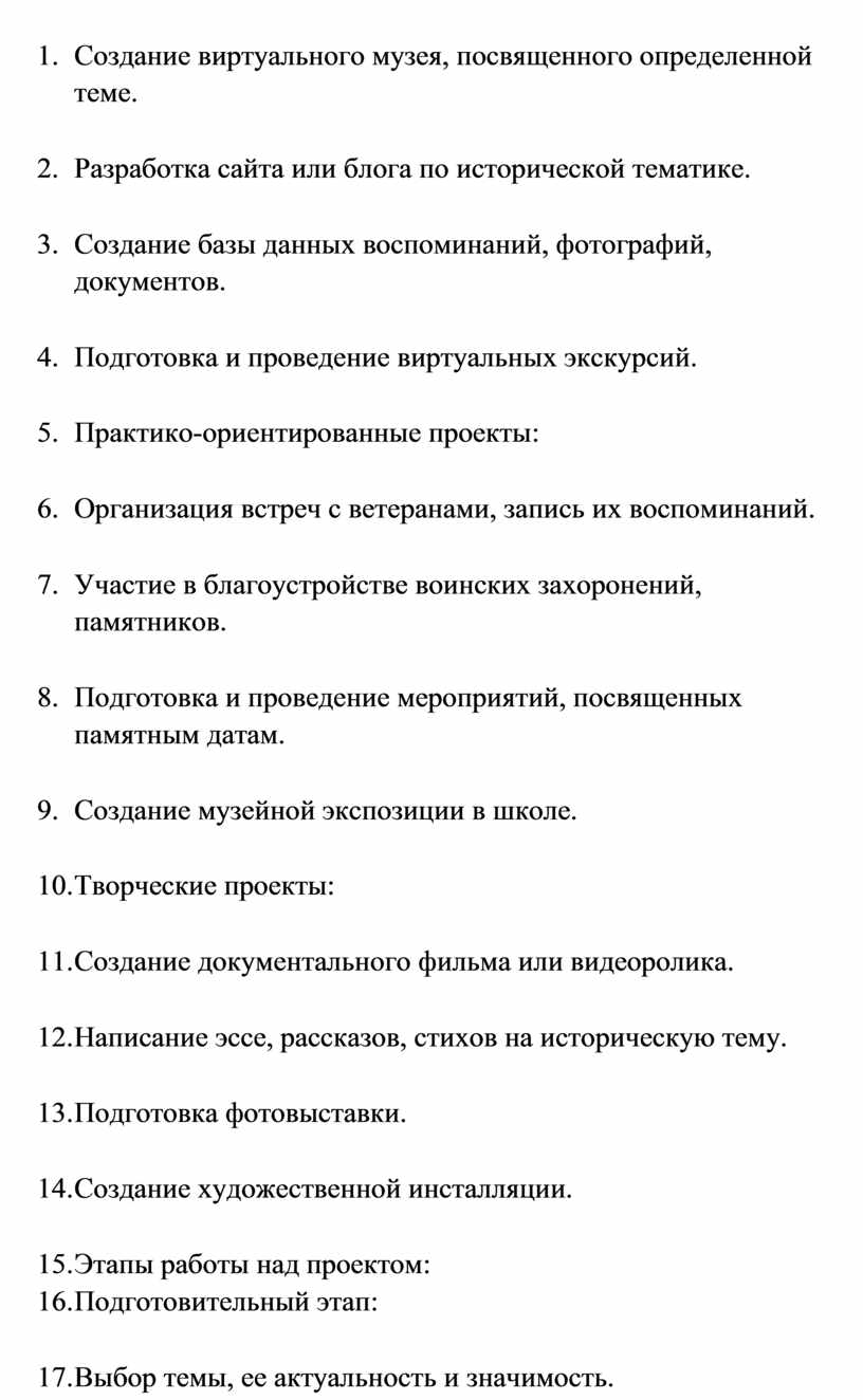 10. "Устная история моего города/села" — сбор и анализ интервью со старожилами, очевидцами значимых событий.