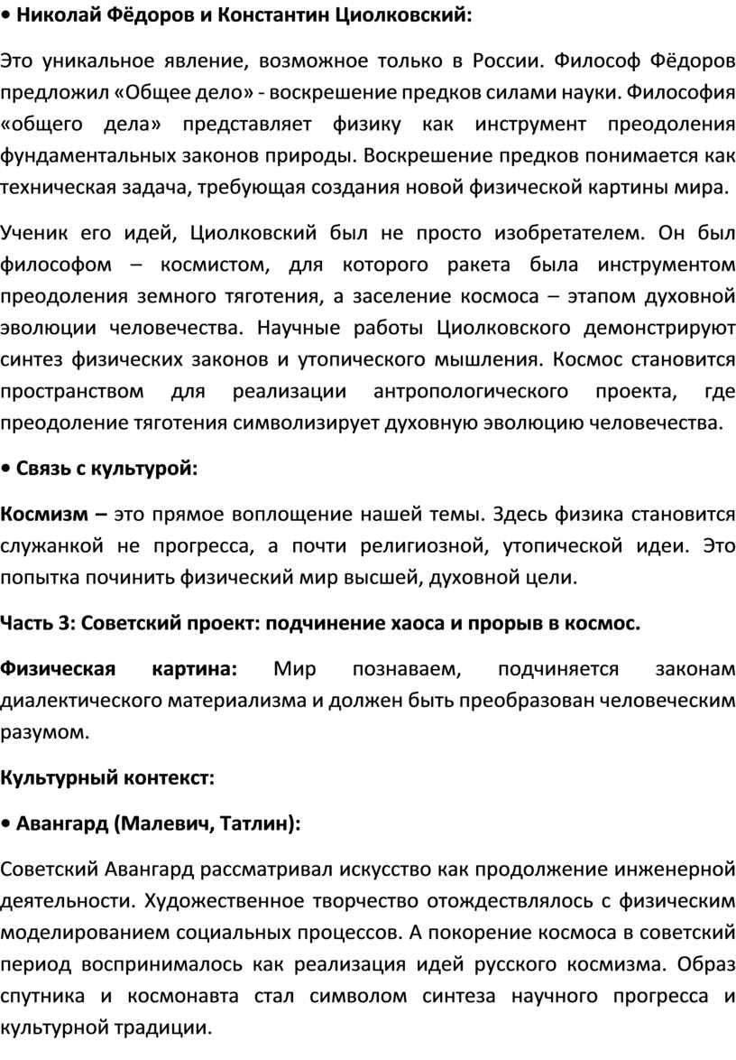 Физическая картина: Идеи о единстве человека и Вселенной, о преодолении сил тяготения и смерти с помощью науки.