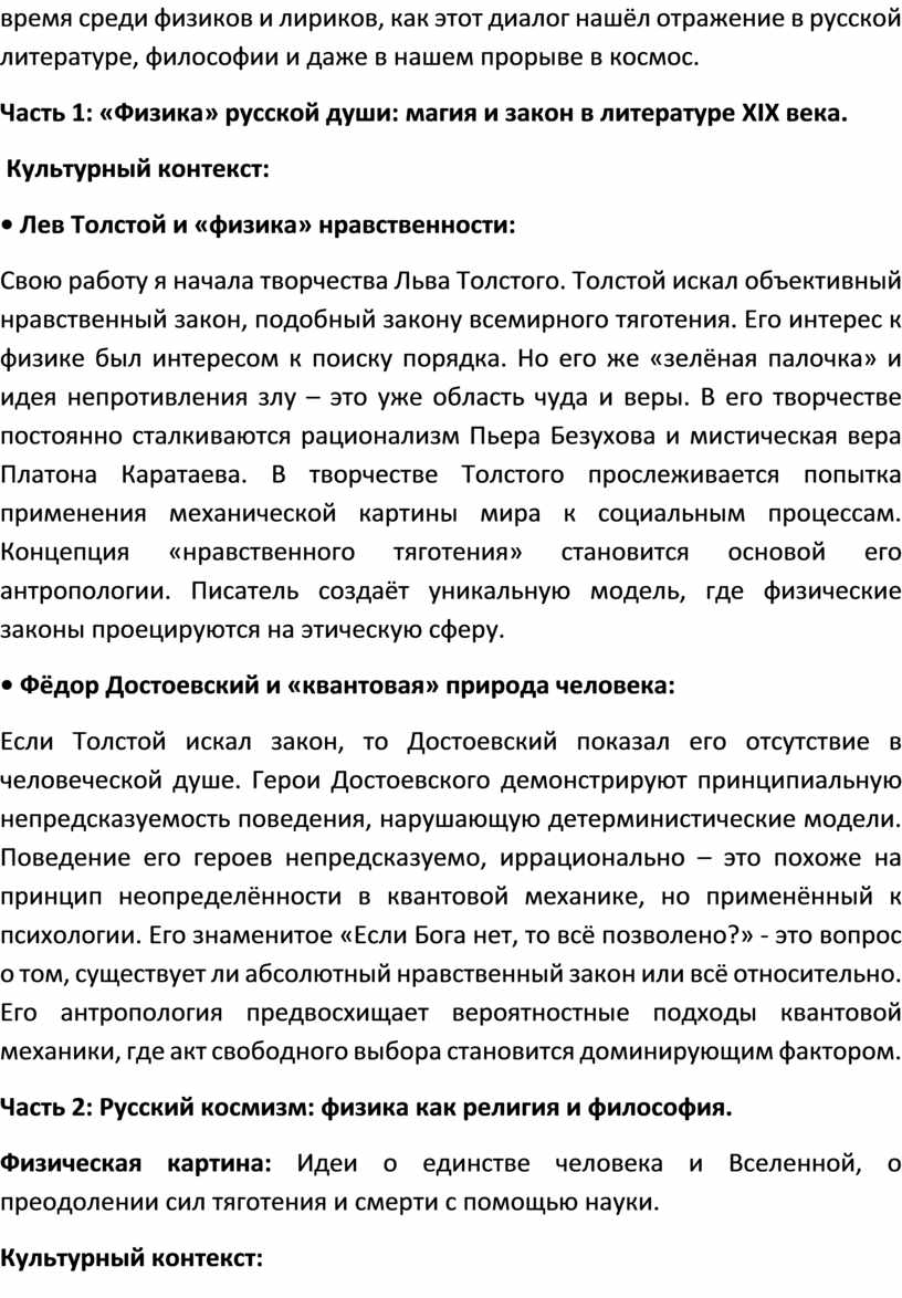 Когда мы говорим о физике в культуре, на ум часто приходят западные примеры: Эйнштейн и Пикассо, Ньютон и классицизм. Но у России – особый путь. Наша культура всегда вела напряжённый диалог между двумя полюсами: с одной стороны – строгий, почти физический поиск всеобщего закона, правды, а с другой – вера в чудо, иррациональное, в особую духовную сущность мира. Я решила проследить, как всё происходило в то время среди физиков и лириков, как этот диалог нашёл отражение в русской литературе, философии и даже в нашем прорыве в космос.
