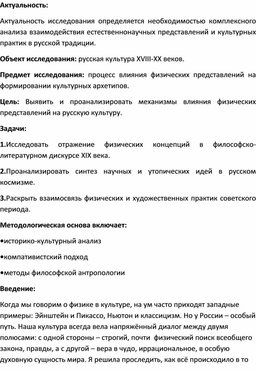 Цель: Выявить и проанализировать механизмы влияния физических представлений на русскую культуру.