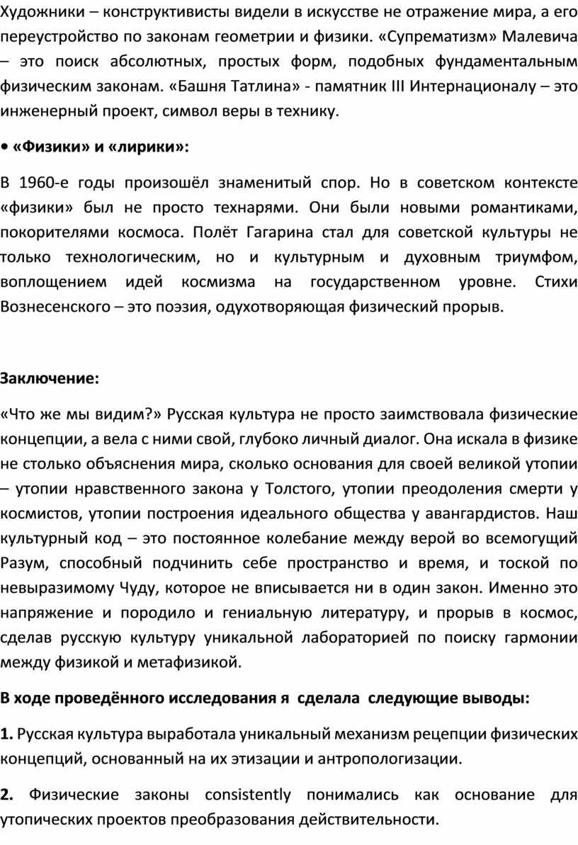 1. Русская культура выработала уникальный механизм рецепции физических концепций, основанный на их этизации и антропологизации.
