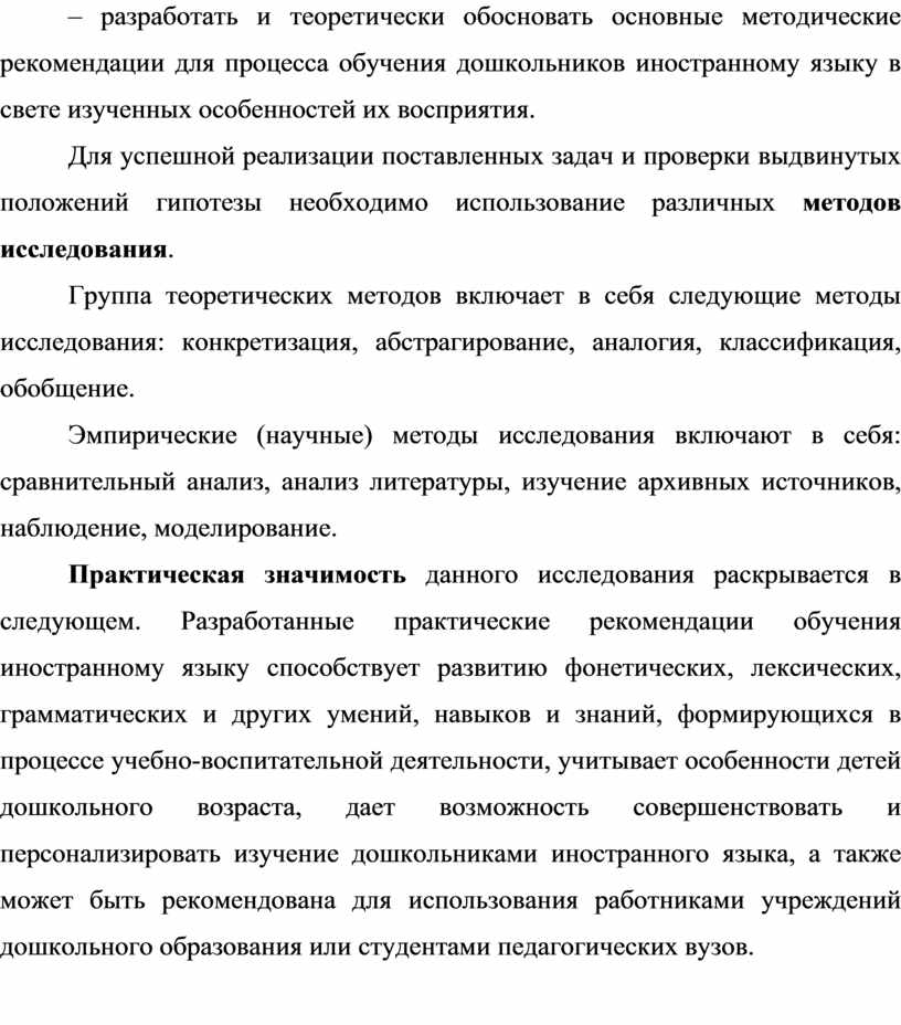 ‒ разработать и теоретически обосновать основные методические рекомендации для процесса обучения дошкольников иностранному языку в свете изученных особенностей их восприятия.