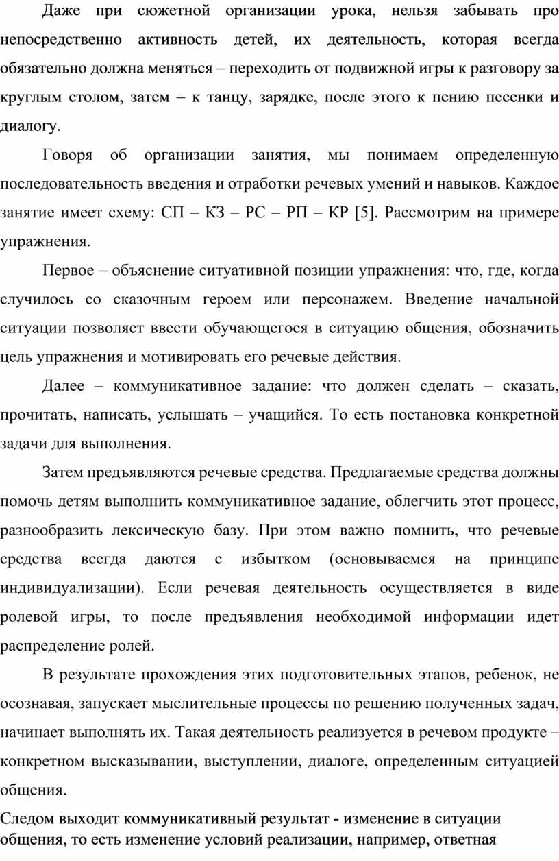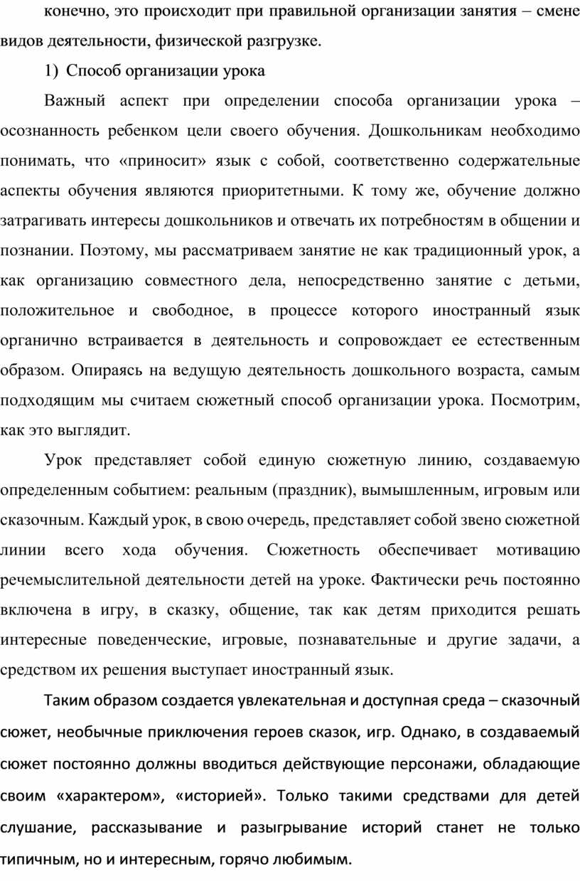 3. Наиболее продуктивный способ организации занятий – сюжетный, строится с учетом возрастных и индивидуальных особенностей структуры лингвистических способностей детей и направлен на их развитие. Урок представляет собой единую сюжетную линию, создаваемую реальным, вымышленным, игровым или сказочным событием. Каждый урок, в свою очередь, представляет собой звено сюжетной линии всего хода обучения. Такой способ организации процесса обучения обеспечивает мотивацию речемыслительной деятельности детей на уроке. Фактически речь постоянно включена в игру, в сказку, общение, так как детям приходится решать интересные поведенческие, игровые, познавательные и другие задачи, а средством их решения выступает иностранный язык. При этом занятия носят комплексный характер и связаны с сенсорным, физическим, интеллектуальным воспитанием личности.