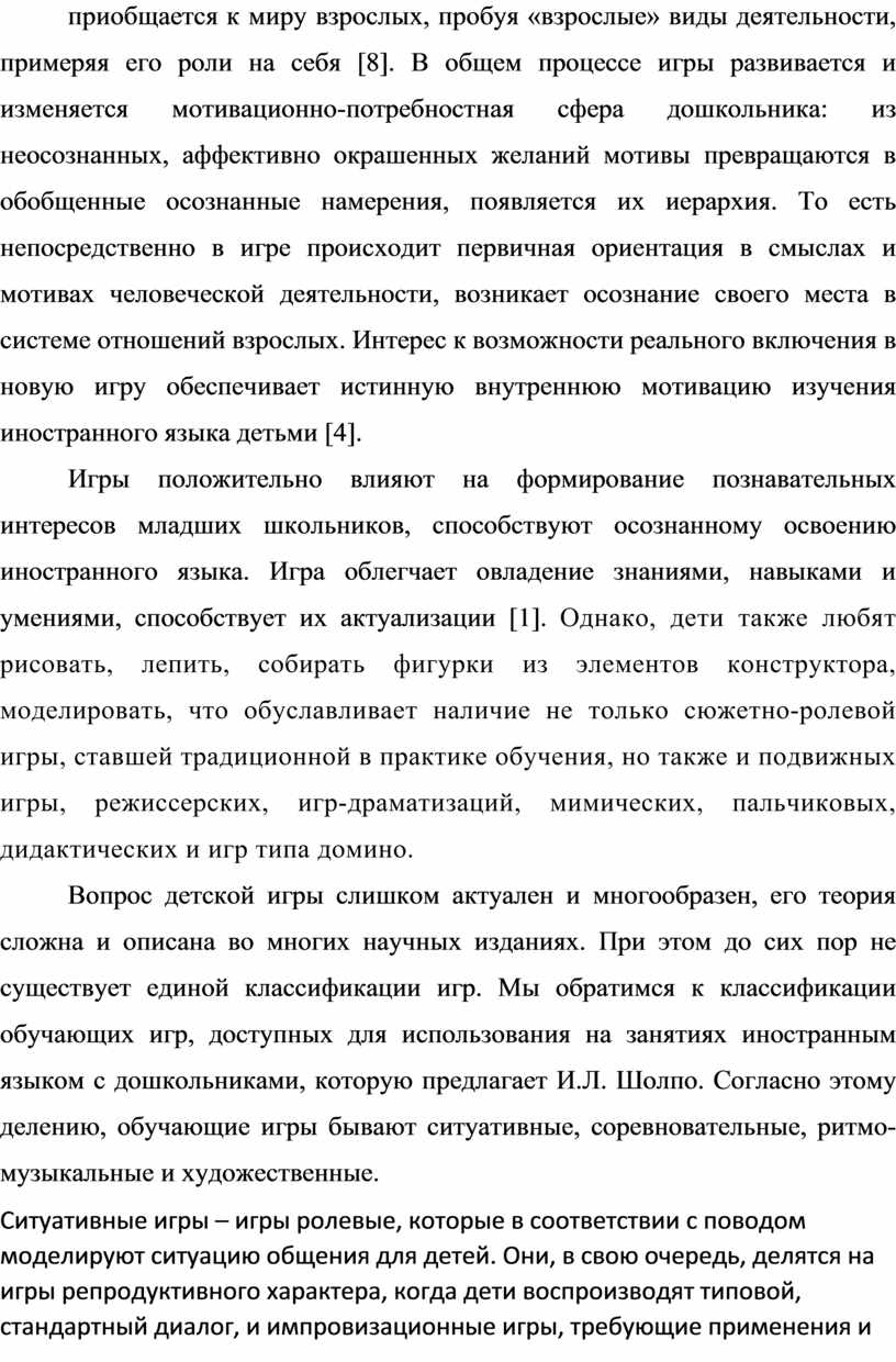 Вопрос детской игры слишком актуален и многообразен, его теория сложна и описана во многих научных изданиях. При этом до сих пор не существует единой классификации игр. Мы обратимся к классификации обучающих игр, доступных для использования на занятиях иностранным языком с дошкольниками, которую предлагает И.Л. Шолпо. Согласно этому делению, обучающие игры бывают ситуативные, соревновательные, ритмо-музыкальные и художественные.