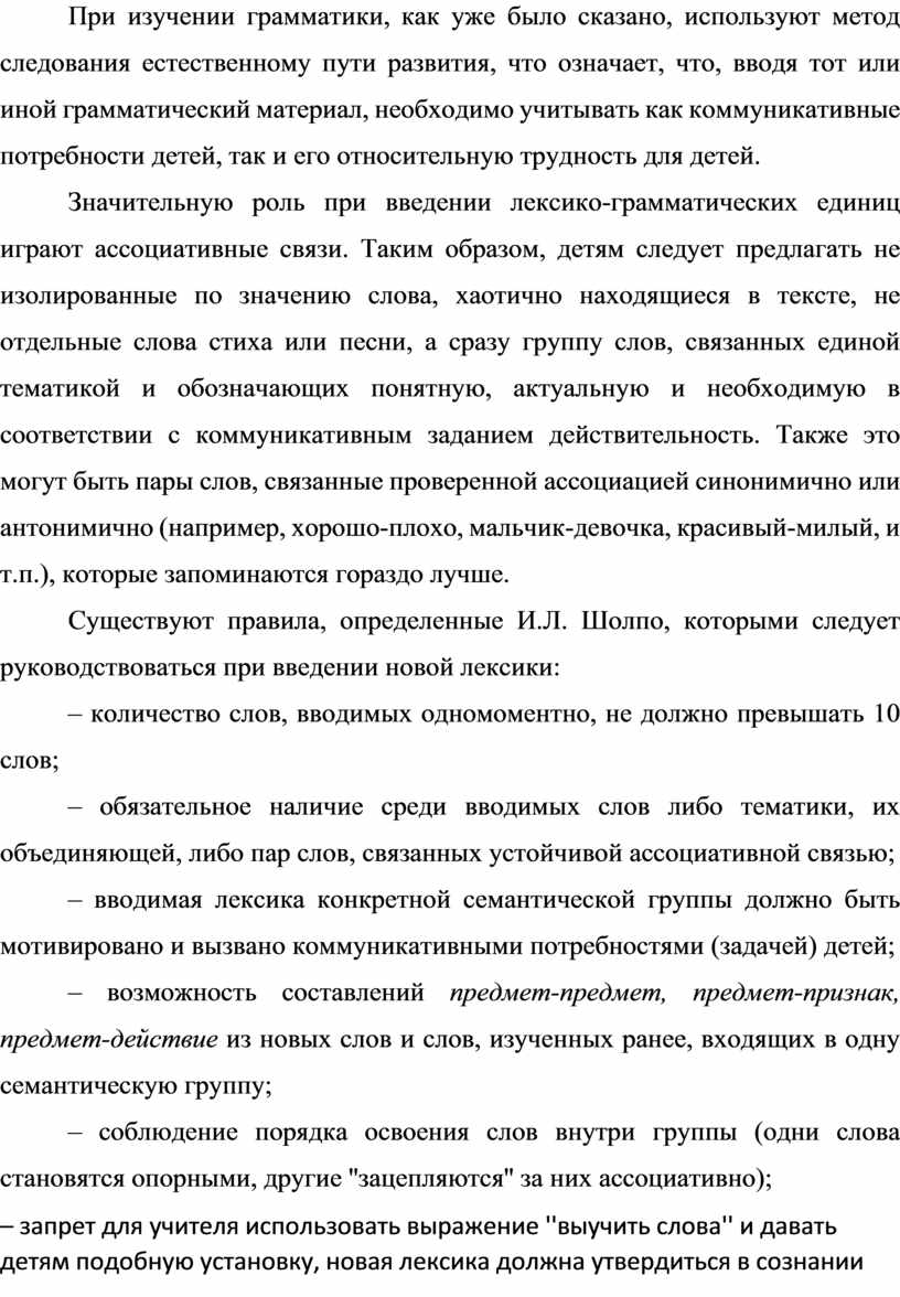 Изучение новой лексики – это ни в коем случае не сухое заучивание необходимого списка слов. Во-первых, любое вводимое слово должно быть коммуникативно значимым для ребенка; во-вторых, вступать в семантические и грамматические связи с другими словами. Велик момент отработки – сразу после введения нового слова необходим переход к действию с ним (описанная выше структура организации занятия). Однако следует помнить, что построение высказывания, как элемент отработки выученной единицы языка, лежит уже в области грамматики. Следовательно, освоение лексического материала невозможно в отрыве от грамматики.