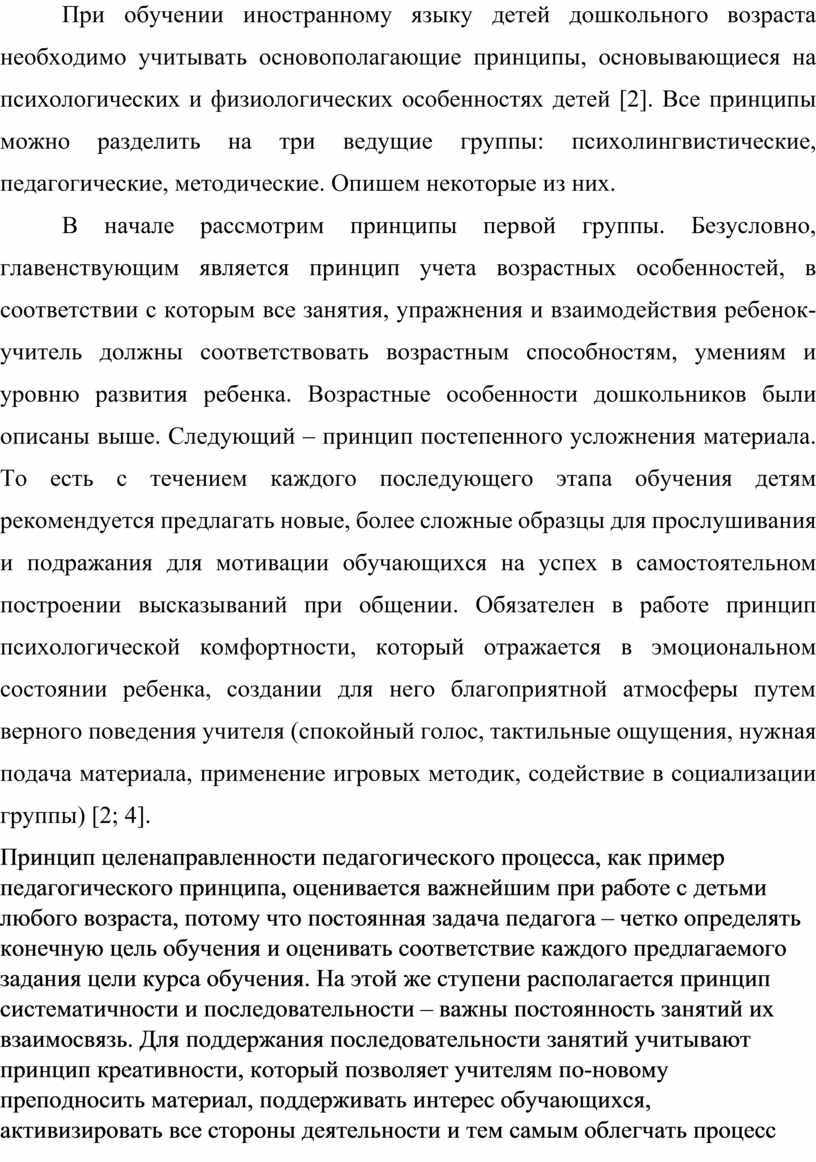 При обучении иностранному языку детей дошкольного возраста необходимо учитывать основополагающие принципы, основывающиеся на психологических и физиологических особенностях детей [2]. Все принципы можно разделить на три ведущие группы: психолингвистические, педагогические, методические. Опишем некоторые из них.