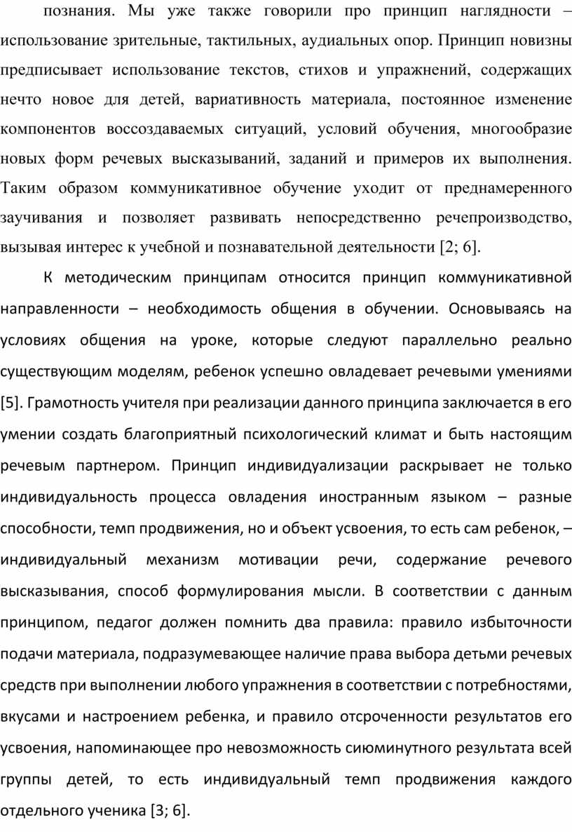 Принцип целенаправленности педагогического процесса, как пример педагогического принципа, оценивается важнейшим при работе с детьми любого возраста, потому что постоянная задача педагога – четко определять конечную цель обучения и оценивать соответствие каждого предлагаемого задания цели курса обучения. На этой же ступени располагается принцип систематичности и последовательности – важны постоянность занятий их взаимосвязь. Для поддержания последовательности занятий учитывают принцип креативности, который позволяет учителям по-новому преподносить материал, поддерживать интерес обучающихся, активизировать все стороны деятельности и тем самым облегчать процесс познания. Мы уже также говорили про принцип наглядности – использование зрительные, тактильных, аудиальных опор. Принцип новизны предписывает использование текстов, стихов и упражнений, содержащих нечто новое для детей, вариативность материала, постоянное изменение компонентов воссоздаваемых ситуаций, условий обучения, многообразие новых форм речевых высказываний, заданий и примеров их выполнения. Таким образом коммуникативное обучение уходит от преднамеренного заучивания и позволяет развивать непосредственно речепроизводство, вызывая интерес к учебной и познавательной деятельности [2; 6].