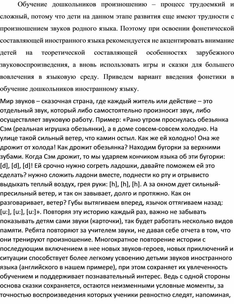 Обучение дошкольников произношению – процесс трудоемкий и сложный, потому что дети на данном этапе развития еще имеют трудности с произношением звуков родного языка. Поэтому при освоении фонетической составляющей иностранного языка рекомендуется не акцентировать внимание детей на теоретической составляющей особенностях зарубежного звуковоспроизведения, а вновь использовать игры и сказки для большего вовлечения в языковую среду. Приведем вариант введения фонетики в обучение дошкольников иностранному языку.