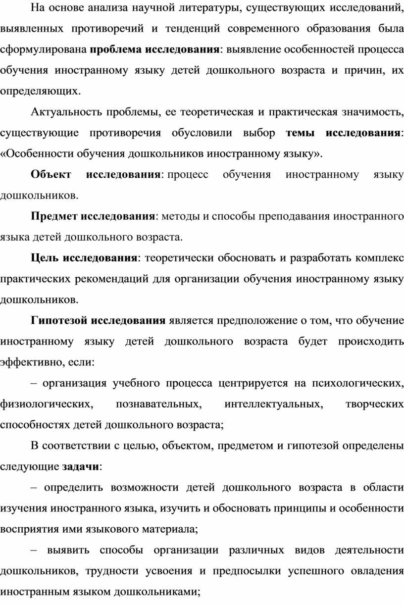 На основе анализа научной литературы, существующих исследований, выявленных противоречий и тенденций современного образования была сформулирована проблема исследования: выявление особенностей процесса обучения иностранному языку детей дошкольного возраста и причин, их определяющих.