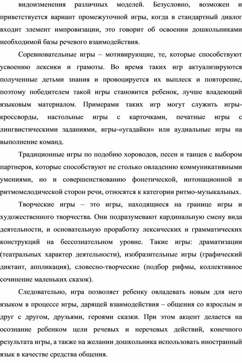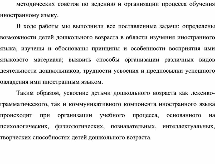 Таким образом, усвоение детьми дошкольного возраста как лексико-грамматического, так и коммуникативного компонента иностранного языка происходит при организации учебного процесса, основанного на психологических, физиологических, познавательных, интеллектуальных, творческих способностях детей дошкольного возраста.