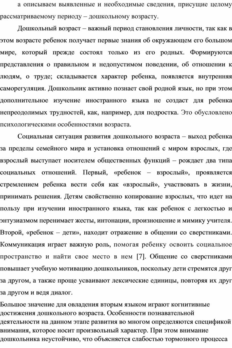 Дошкольный возраст – важный период становления личности, так как в этом возрасте ребенок получает первые знания об окружающем его большом мире, который прежде состоял только из его родных. Формируются представления о правильном и недопустимом поведении, об отношении к людям, о труде; складывается характер ребенка, появляется внутренняя саморегуляция. Дошкольник активно познает свой родной язык, но при этом дополнительное изучение иностранного языка не создаст для ребенка непреодолимых трудностей, как, например, для подростка. Это обусловлено психологическими особенностями возраста.