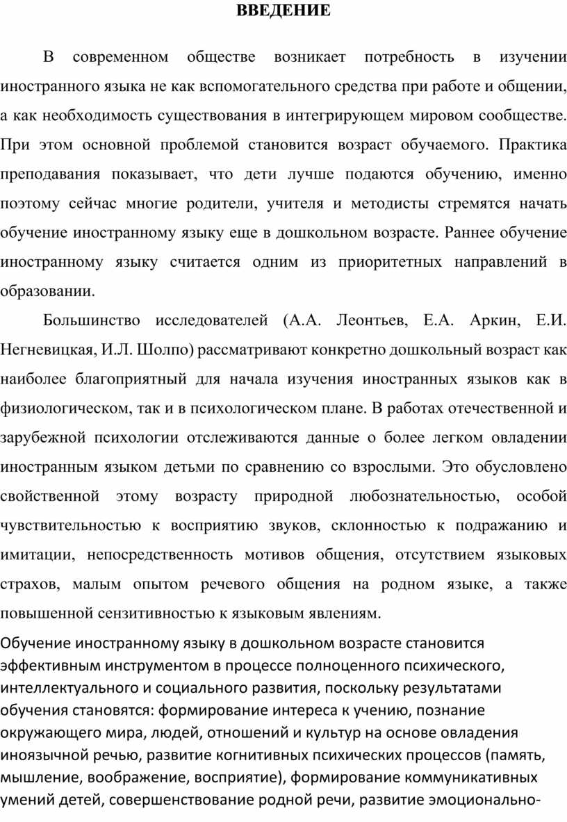 В современном обществе возникает потребность в изучении иностранного языка не как вспомогательного средства при работе и общении, а как необходимость существования в интегрирующем мировом сообществе. При этом основной проблемой становится возраст обучаемого. Практика преподавания показывает, что дети лучше подаются обучению, именно поэтому сейчас многие родители, учителя и методисты стремятся начать обучение иностранному языку еще в дошкольном возрасте. Раннее обучение иностранному языку считается одним из приоритетных направлений в образовании.