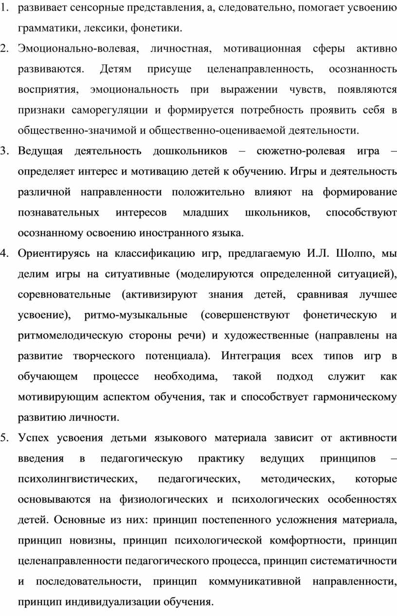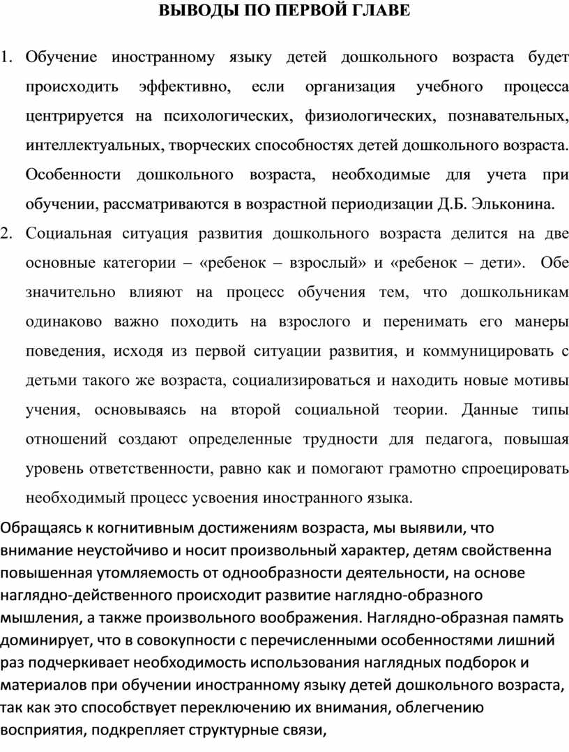 1. Обучение иностранному языку детей дошкольного возраста будет происходить эффективно, если организация учебного процесса центрируется на психологических, физиологических, познавательных, интеллектуальных, творческих способностях детей дошкольного возраста. Особенности дошкольного возраста, необходимые для учета при обучении, рассматриваются в возрастной периодизации Д.Б. Эльконина.