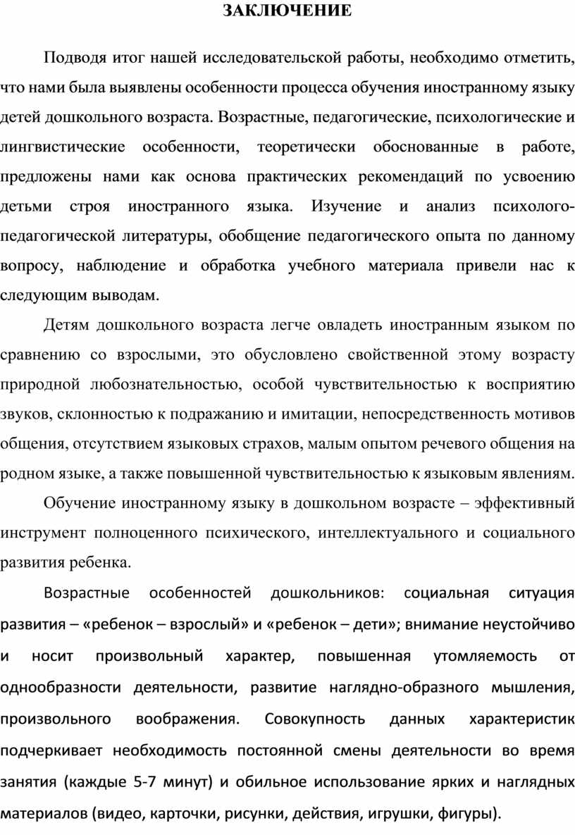 Подводя итог нашей исследовательской работы, необходимо отметить, что нами была выявлены особенности процесса обучения иностранному языку детей дошкольного возраста. Возрастные, педагогические, психологические и лингвистические особенности, теоретически обоснованные в работе, предложены нами как основа практических рекомендаций по усвоению детьми строя иностранного языка. Изучение и анализ психолого-педагогической литературы, обобщение педагогического опыта по данному вопросу, наблюдение и обработка учебного материала привели нас к следующим выводам.