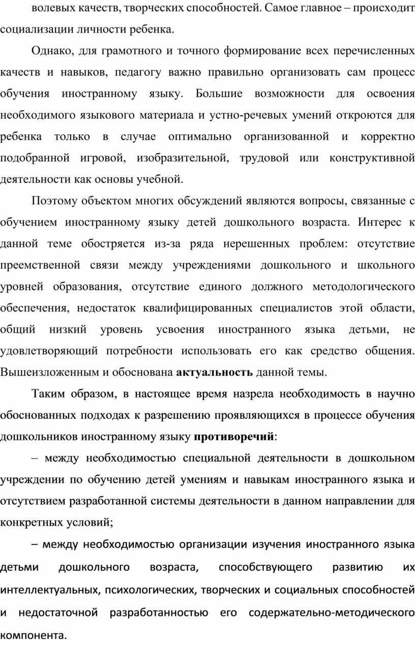 – между необходимостью организации изучения иностранного языка детьми дошкольного возраста, способствующего развитию их интеллектуальных, психологических, творческих и социальных способностей и недостаточной разработанностью его содержательно-методического компонента.
