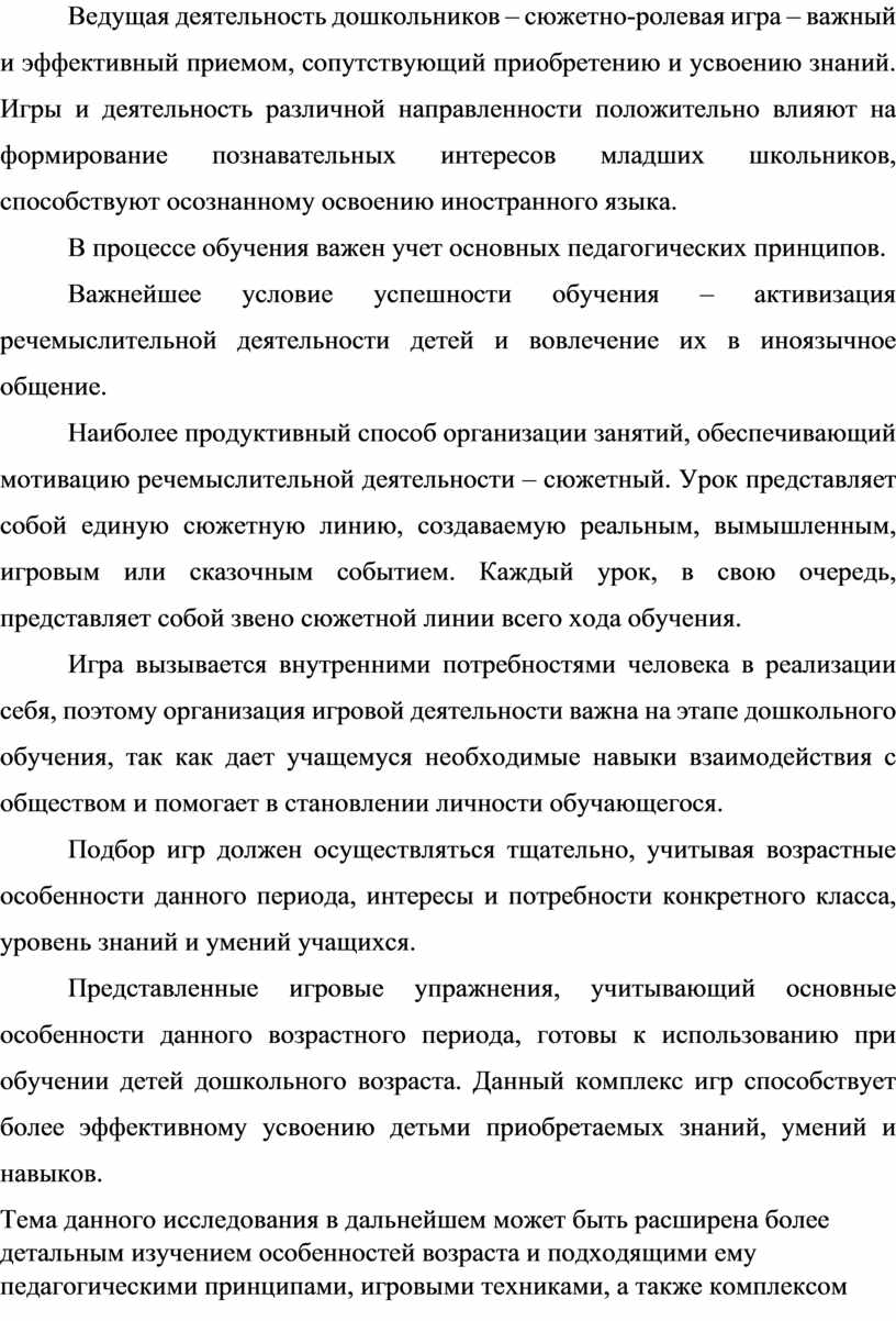 Тема данного исследования в дальнейшем может быть расширена более детальным изучением особенностей возраста и подходящими ему педагогическими принципами, игровыми техниками, а также комплексом методических советов по ведению и организации процесса обучения иностранному языку.