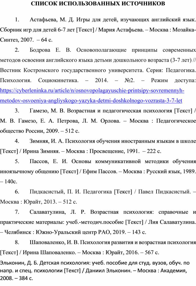 9. Эльконин, Д. Б. Детская психология: учеб. пособие для студ. вузов, обуч. по напр. и спец. психологии [Текст] / Даниил Эльконин. – Москва : Академия, 2008. – 384 с.
