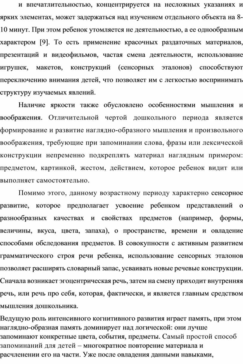 Большое значение для овладения вторым языком играют когнитивные достижения дошкольного возраста. Особенности познавательной деятельности на данном этапе развития во многом определяются спецификой внимания, которое носит произвольный характер. При этом внимание дошкольника неустойчиво, что объясняется слабостью тормозного процесса и впечатлительностью, концентрируется на несложных указаниях и ярких элементах, может задержаться над изучением отдельного объекта на 8-10 минут. При этом ребенок утомляется не деятельностью, а ее однообразным характером [9]. То есть применение красочных раздаточных материалов, презентаций и видеофильмов, частая смена деятельности, использование игрушек, макетов, конструкций (сенсорных эталонов) способствуют переключению внимания детей, что позволяет им с легкостью воспринимать структуру изучаемых явлений.