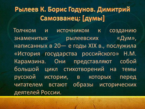 Толчком и источником к созданию знаменитых рылеевских «Дум», написанных в 20— е годы ХIХ в., послужила «История государства российского» Н.М. Карамзина. Они представляют собой большой цикл стихотворений на темы русской истории, в которых перед читателем встают образы исторических деятелей России.