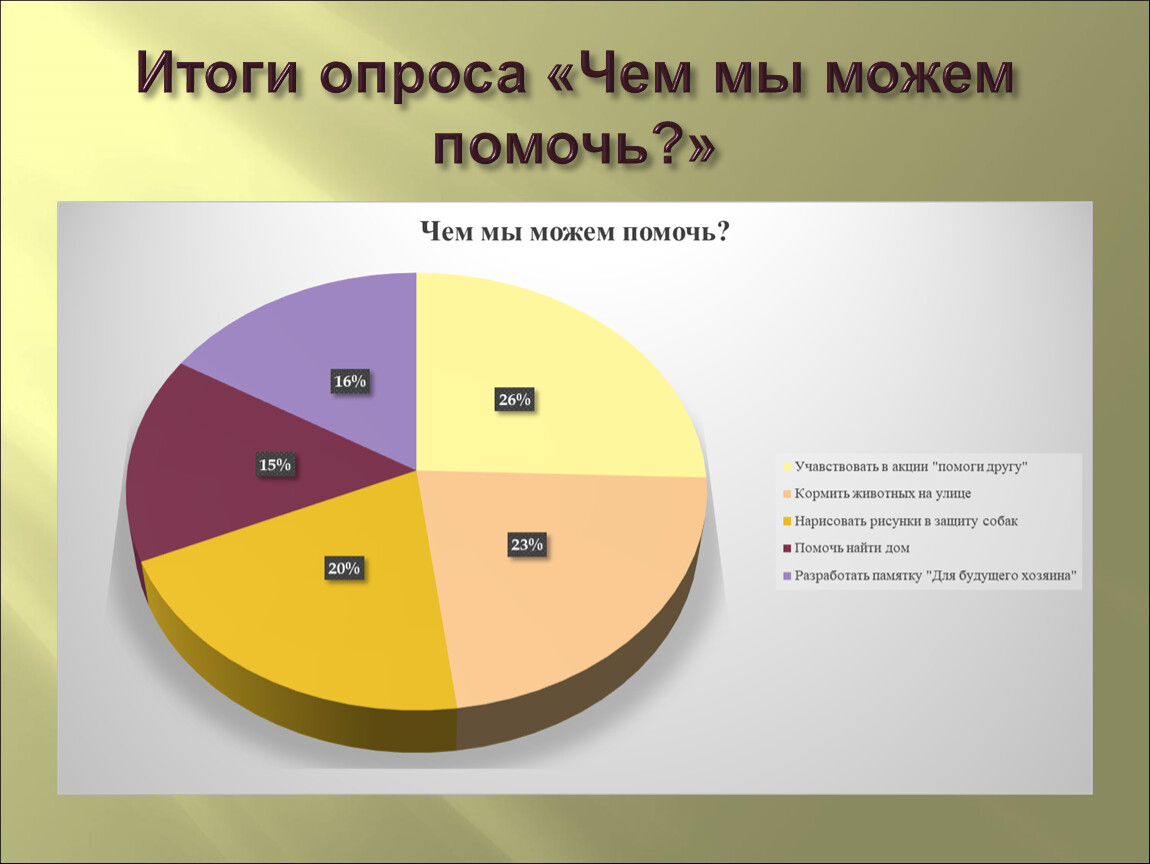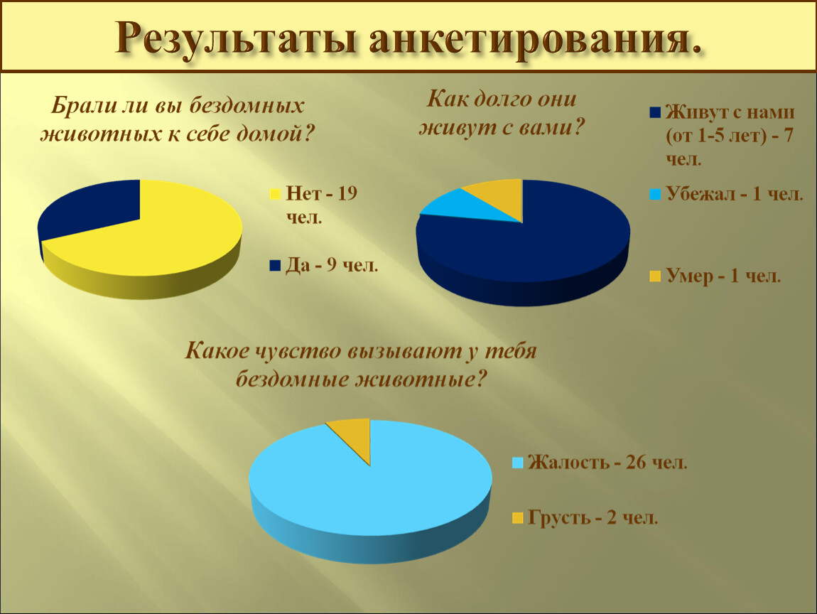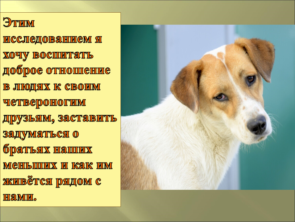 Этим исследованием я хочу воспитать доброе отношение в людях к своим четвероногим друзьям, заставить задуматься о братьях наших меньших и как им живётся рядом с нами.