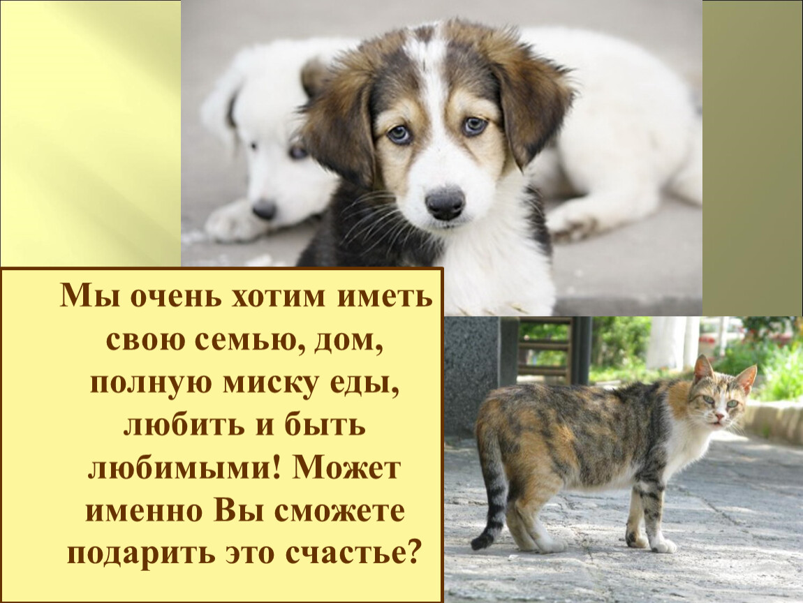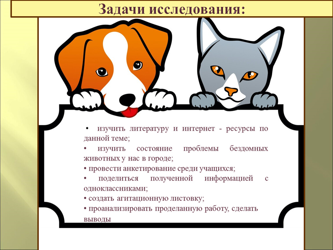 Выяснить основные причины появления на улицах бездомных животных, привлечь к проблеме бездомных животных учащихся и взрослых.