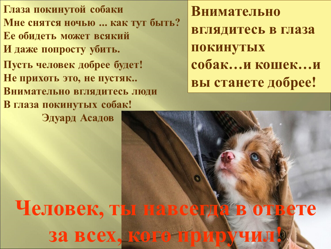 Глаза покинутой собаки Мне снятся ночью ... как тут быть? Ее обидеть может всякий И даже попросту убить.