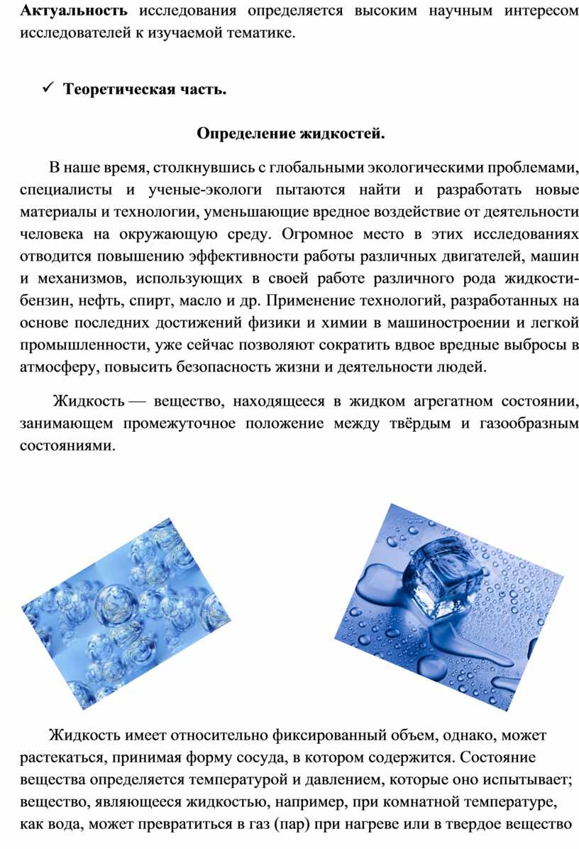 Жидкость имеет относительно фиксированный объем, однако, может растекаться, принимая форму сосуда, в котором содержится. Состояние вещества определяется температурой и давлением, которые оно испытывает; вещество, являющееся жидкостью, например, при комнатной температуре, как вода, может превратиться в газ (пар) при нагреве или в твердое вещество (лед) при охлаждении. Молекулы жидкости, в отличие от молекул газа, связаны друг с другом, хотя и слабо, кроме того, жидкости, подобно твердым телам, плохо поддаются сжатию под давлением. Вода - наиболее распространенная жидкость на планете. Большую часть планеты покрывает вода. Человек примерно на 80% состоит из воды. Вода присутствует практически во всех веществах. Нам хорошо известно три агрегатных состояния жидкостей - жидкое, твердое и газообразное. Нас окружает огромное количество жидкостей. Жидкость окружает везде и всегда. Сами люди состоят из жидкости, вода дает нам жизнь, из воды мы вышли и к воде всегда возвращаемся. Мы все время сталкиваемся с использованием жидкостей, пьем чай, моем руки, заливаем бензин в автомобиль, наливаем масло на сковороду. Основным свойством жидкости является то, что она способна менять свою форму под действием механического воздействия.
