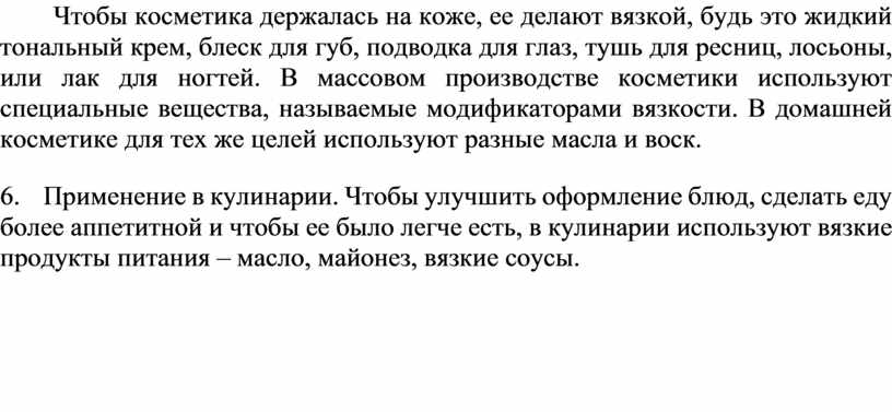 Чтобы косметика держалась на коже, ее делают вязкой, будь это жидкий тональный крем, блеск для губ, подводка для глаз, тушь для ресниц, лосьоны, или лак для ногтей. В массовом производстве косметики используют специальные вещества, называемые модификаторами вязкости. В домашней косметике для тех же целей используют разные масла и воск.