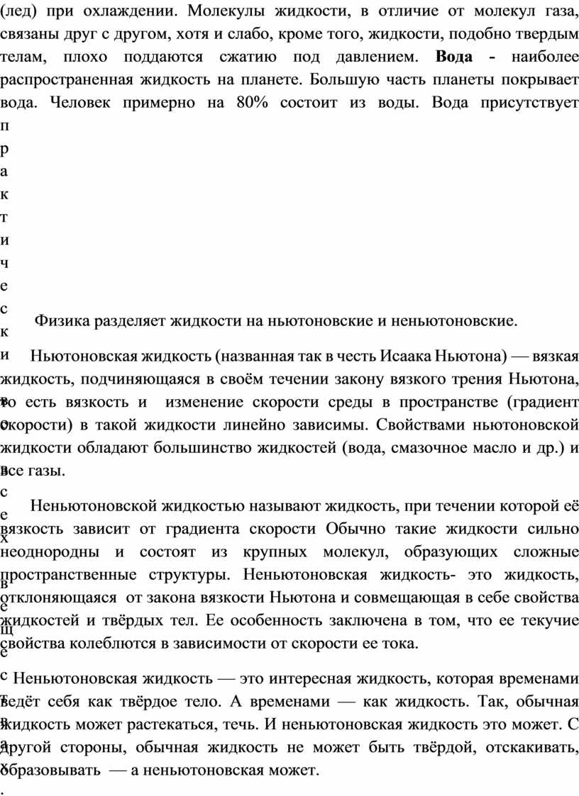 Неньютоновской жидкостью называют жидкость, при течении которой её вязкость зависит от градиента скорости Обычно такие жидкости сильно неоднородны и состоят из крупных молекул, образующих сложные пространственные структуры. Неньютоновская жидкость- это жидкость, отклоняющаяся от закона вязкости Ньютона и совмещающая в себе свойства жидкостей и твёрдых тел. Ее особенность заключена в том, что ее текучие свойства колеблются в зависимости от скорости ее тока.