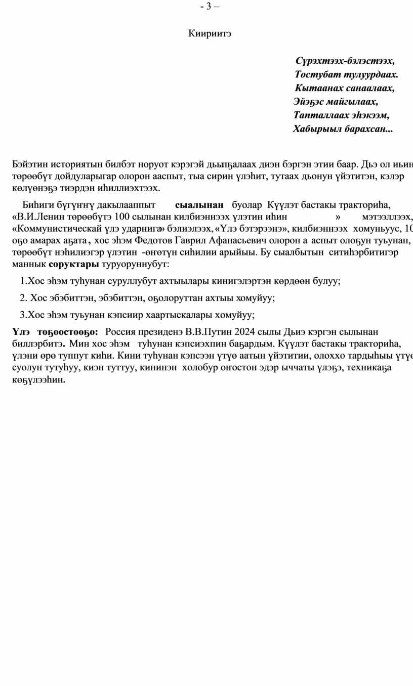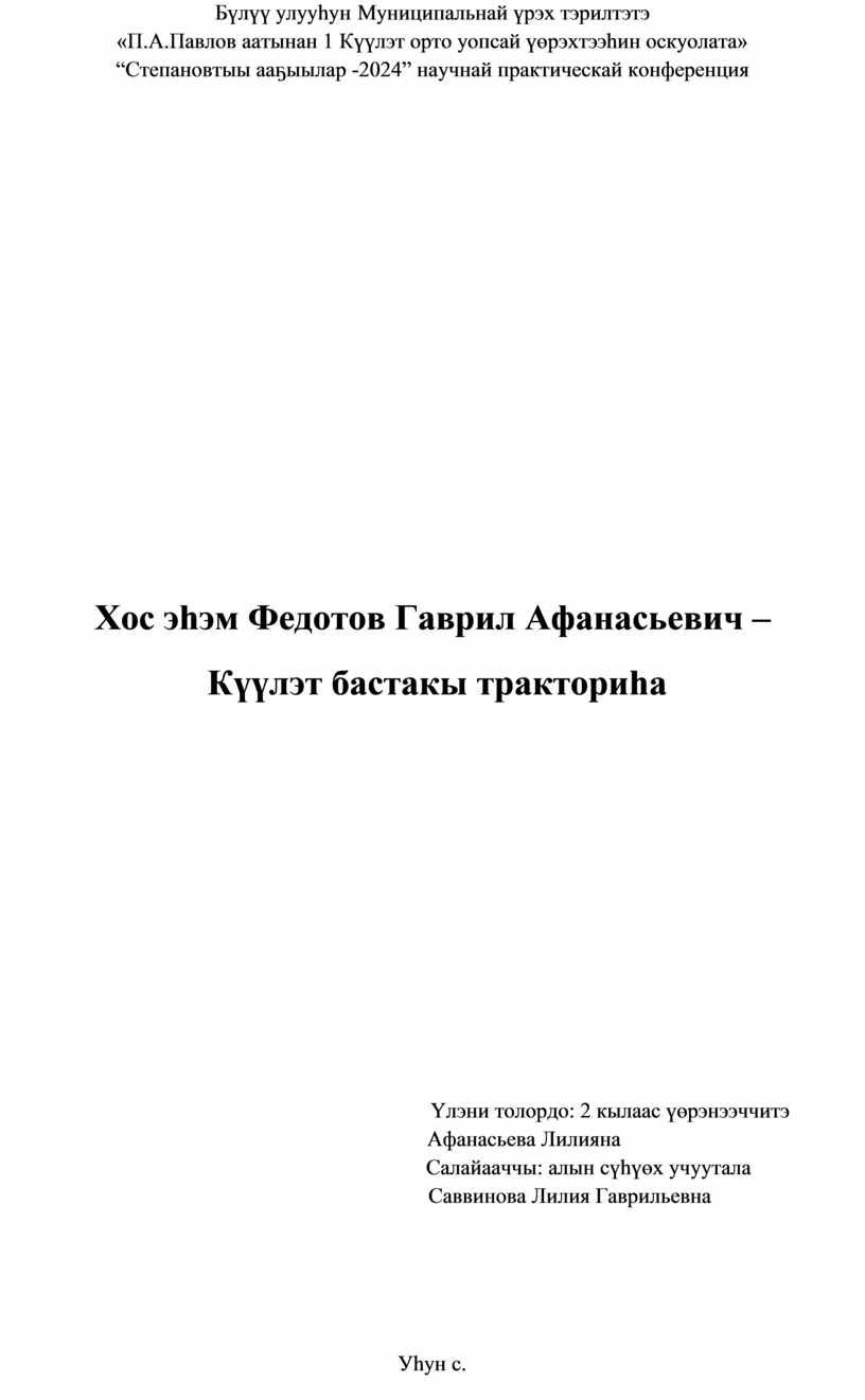 Үлэ тоҕоостооҕо: Россия президенэ В.В.Путин 2024 сылы Дьиэ кэргэн сылынан биллэрбитэ. Мин хос эһэм туһунан кэпсиэхпин баҕардым. Күүлэт бастакы тракториһа, үлэни өрө туппут киһи. Кини туһунан кэпсээн үтүө аатын үйэтитии, олоххо тардыһыы үтүө суолун тутуһуу, киэн туттуу, кининэн холобур оҥостон эдэр ыччаты үлэҕэ, техникаҕа көҕүлээһин.
