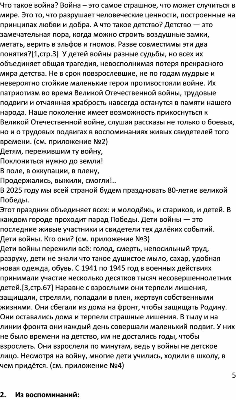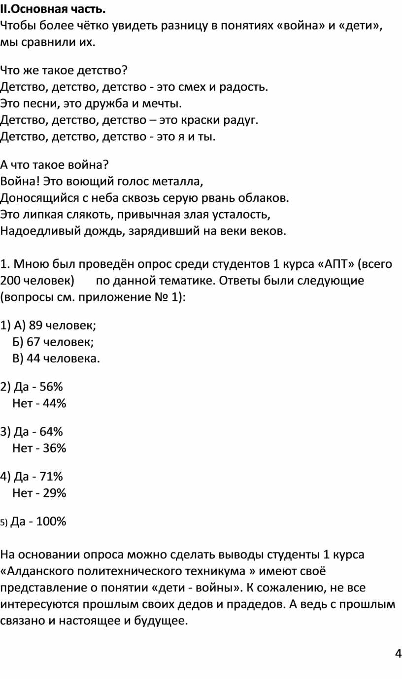 Что такое война? Война – это самое страшное, что может случиться в мире. Это то, что разрушает человеческие ценности, построенные на принципах любви и добра. А что такое детство? Детство — это замечательная пора, когда можно строить воздушные замки, метать, верить в эльфов и гномов. Разве совместимы эти два понятия?[1,стр.3] У детей войны разные судьбы, но всех их объединяет общая трагедия, невосполнимая потеря прекрасного мира детства. Не в срок повзрослевшие, не по годам мудрые и невероятно стойкие маленькие герои противостояли войне. Их патриотизм во время Великой Отечественной войны, трудовые подвиги и отчаянная храбрость навсегда останутся в памяти нашего народа. Наше поколение имеет возможность прикоснуться к Великой Отечественной войне, слушая рассказы не только о боевых, но и о трудовых подвигах в воспоминаниях живых свидетелей того времени. (см. приложение №2)