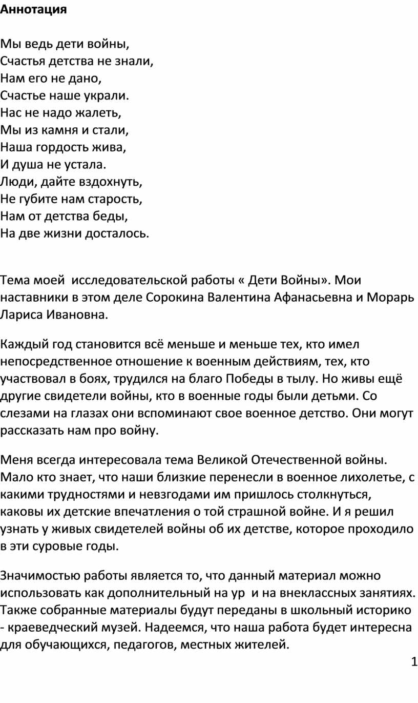 С каждым годом всё дальше и дальше вглубь истории уходят события Великой Отечественной войны, а память вновь и вновь возвращает нас к грозным событиям 1941 года. Понять и оценить настоящее, можно только сравнив его с прошлым. Они уже седые, эти мальчишки и девчонки, выросшие и уцелевшие в военное лихолетье Великой Отечественной. И послевоенная пора была у них суровой, а подчас и жестокой. И пока эти люди живы, мы должны узнать от них самих об их судьбах и жизненной дороге. Это нужно нам, живым сейчас. Поэтому наша работа «Дети войны» актуальна. Война отбирает у мальчиков и девочек детство – настоящее, солнечное, с книгами и тетрадями, смехом, играми и праздниками. Самой природой, условиями существования рода человеческого детям предназначено жить в мире!