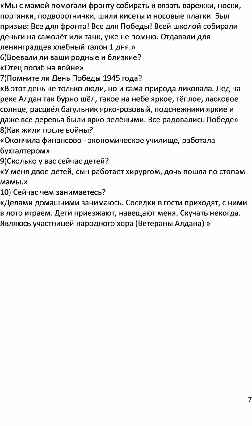 «В этот день не только люди, но и сама природа ликовала. Лёд на реке Алдан так бурно шёл, такое на небе яркое, тёплое, ласковое солнце, расцвёл багульник ярко-розовый, подснежники яркие и даже все деревья были ярко-зелёными. Все радовались Победе» 8)Как жили после войны?