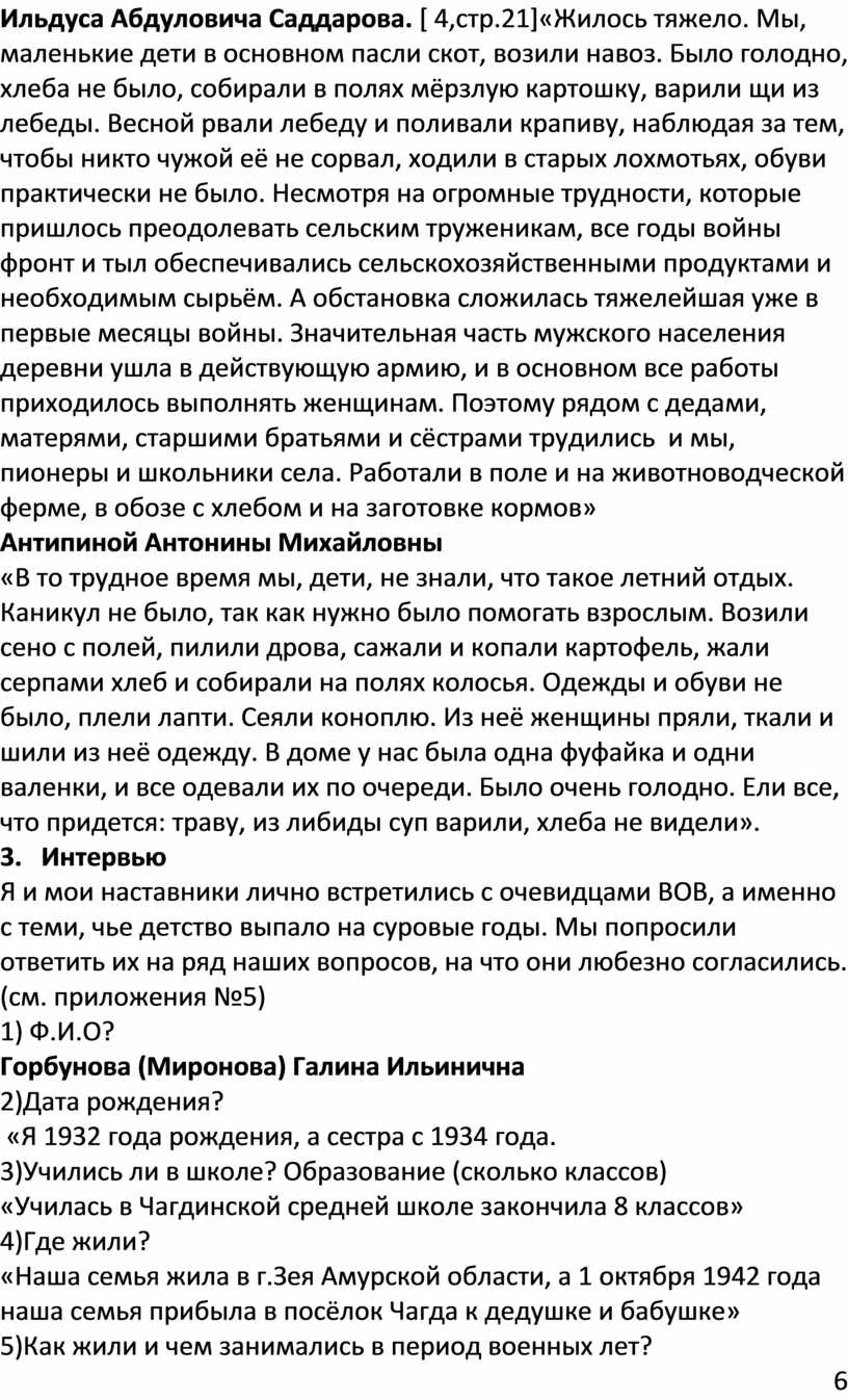Ильдуса Абдуловича Саддарова. [ 4,стр.21]«Жилось тяжело. Мы, маленькие дети в основном пасли скот, возили навоз. Было голодно, хлеба не было, собирали в полях мёрзлую картошку, варили щи из лебеды. Весной рвали лебеду и поливали крапиву, наблюдая за тем, чтобы никто чужой её не сорвал, ходили в старых лохмотьях, обуви практически не было. Несмотря на огромные трудности, которые пришлось преодолевать сельским труженикам, все годы войны фронт и тыл обеспечивались сельскохозяйственными продуктами и необходимым сырьём. А обстановка сложилась тяжелейшая уже в первые месяцы войны. Значительная часть мужского населения деревни ушла в действующую армию, и в основном все работы приходилось выполнять женщинам. Поэтому рядом с дедами, матерями, старшими братьями и сёстрами трудились и мы, пионеры и школьники села. Работали в поле и на животноводческой ферме, в обозе с хлебом и на заготовке кормов»