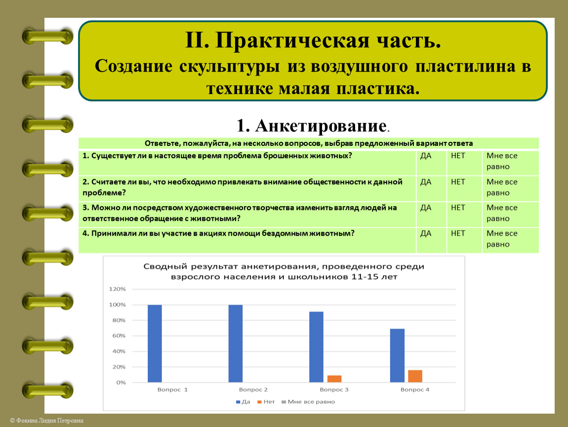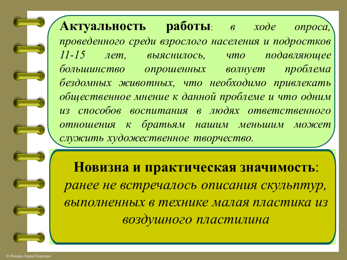 Актуальность работы: в ходе опроса, проведенного среди взрослого населения и подростков 11-15 лет, выяснилось, что подавляющее большинство опрошенных волнует проблема бездомных животных, что необходимо привлекать общественное мнение к данной проблеме и что одним из способов воспитания в людях ответственного отношения к братьям нашим меньшим может служить художественное творчество.