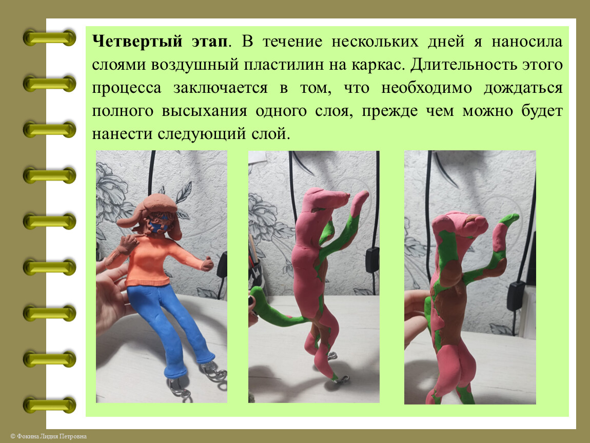 Четвертый этап. В течение нескольких дней я наносила слоями воздушный пластилин на каркас. Длительность этого процесса заключается в том, что необходимо дождаться полного высыхания одного слоя, прежде чем можно будет нанести следующий слой.