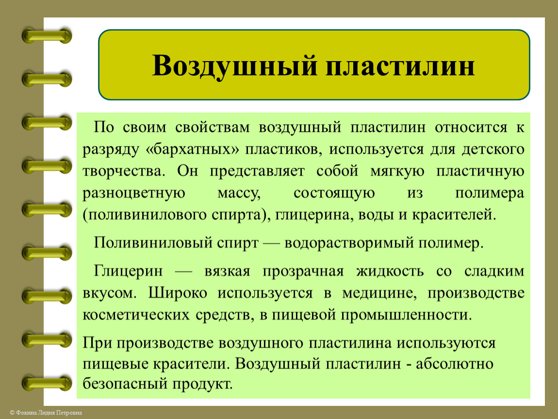 По своим свойствам воздушный пластилин относится к разряду «бархатных» пластиков, используется для детского творчества. Он представляет собой мягкую пластичную разноцветную массу, состоящую из полимера (поливинилового спирта), глицерина, воды и красителей.