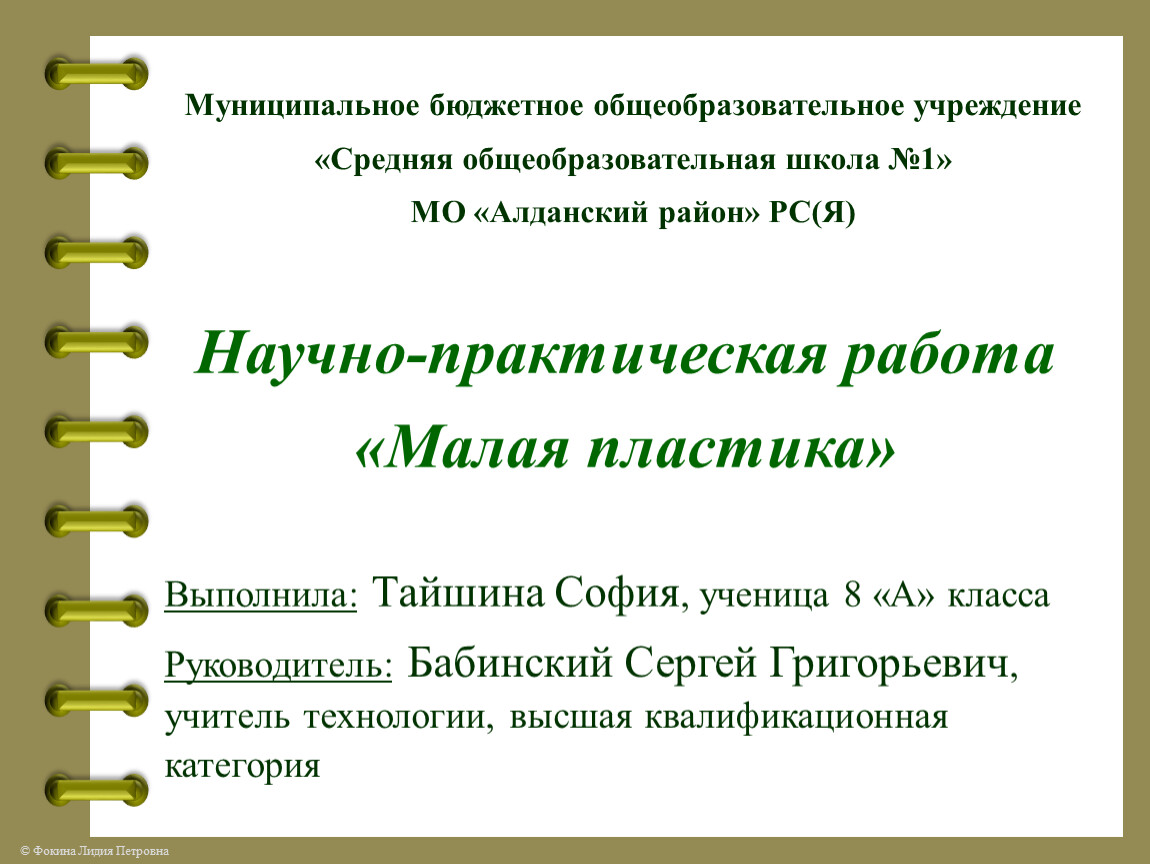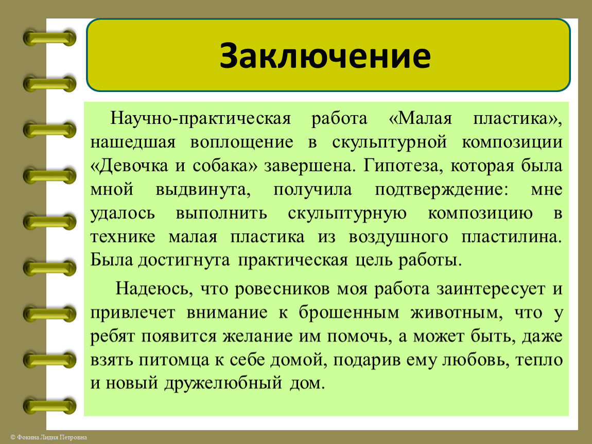 Научно-практическая работа «Малая пластика», нашедшая воплощение в скульптурной композиции «Девочка и собака» завершена. Гипотеза, которая была мной выдвинута, получила подтверждение: мне удалось выполнить скульптурную композицию в технике малая пластика из воздушного пластилина. Была достигнута практическая цель работы.