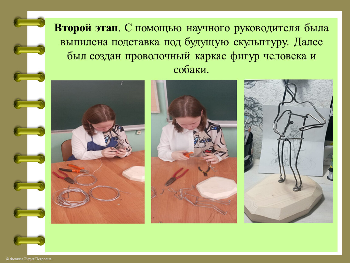 Второй этап. С помощью научного руководителя была выпилена подставка под будущую скульптуру. Далее был создан проволочный каркас фигур человека и собаки.