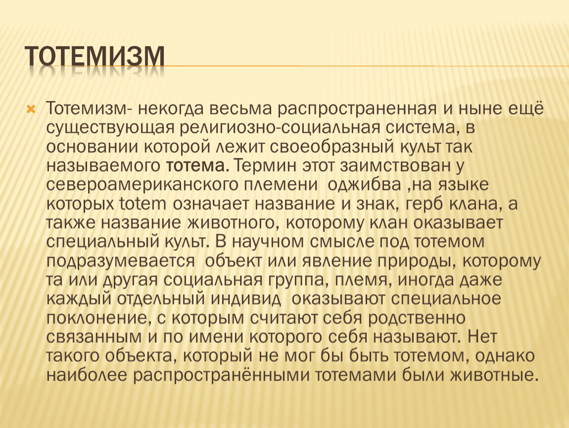 Тотемизм- некогда весьма распространенная и ныне ещё существующая религиозно-социальная система, в основании которой лежит своеобразный культ так называемого тотема. Термин этот заимствован у североамериканского племени оджибва ,на языке которых totem означает название и знак, герб клана, а также название животного, которому клан оказывает специальный культ. В научном смысле под тотемом подразумевается объект или явление природы, которому та или другая социальная группа, племя, иногда даже каждый отдельный индивид оказывают специальное поклонение, с которым считают себя родственно связанным и по имени которого себя называют. Нет такого объекта, который не мог бы быть тотемом, однако наиболее распространёнными тотемами были животные.