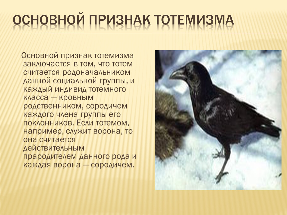 Основной признак тотемизма заключается в том, что тотем считается родоначальником данной социальной группы, и каждый индивид тотемного класса — кровным родственником, сородичем каждого члена группы его поклонников. Если тотемом, например, служит ворона, то она считается действительным прародителем данного рода и каждая ворона — сородичем.