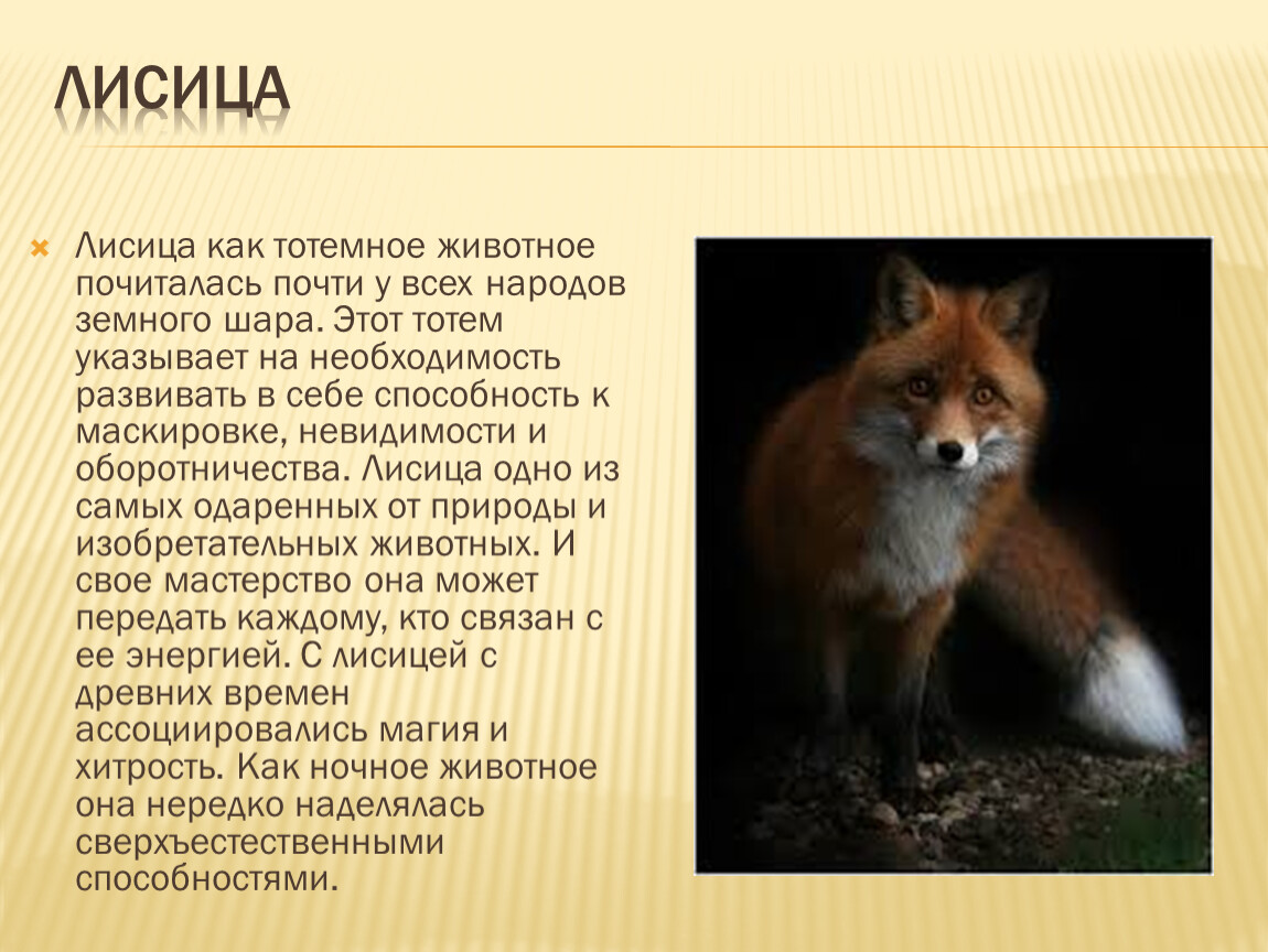 Лисица как тотемное животное почиталась почти у всех народов земного шара. Этот тотем указывает на необходимость развивать в себе способность к маскировке, невидимости и оборотничества. Лисица одно из самых одаренных от природы и изобретательных животных. И свое мастерство она может передать каждому, кто связан с ее энергией. С лисицей с древних времен ассоциировались магия и хитрость. Как ночное животное она нередко наделялась сверхъестественными способностями.