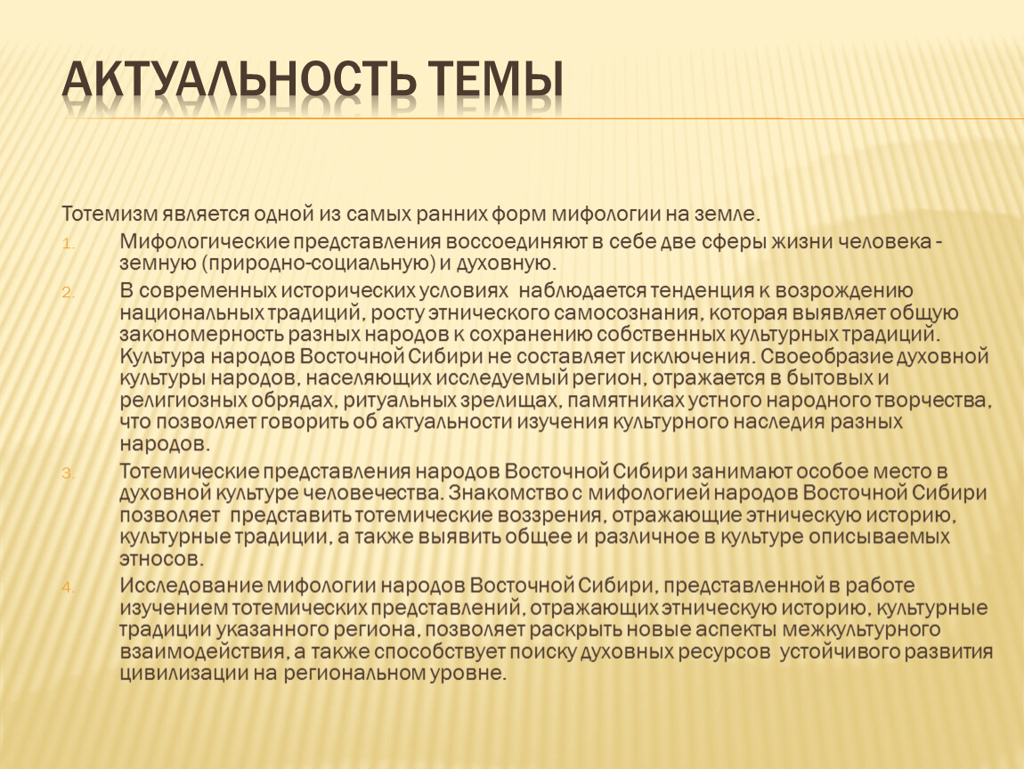 Исследование мифологии народов Восточной Сибири, представленной в работе изучением тотемических представлений, отражающих этническую историю, культурные традиции указанного региона, позволяет раскрыть новые аспекты межкультурного взаимодействия, а также способствует поиску духовных ресурсов устойчивого развития цивилизации на региональном уровне.