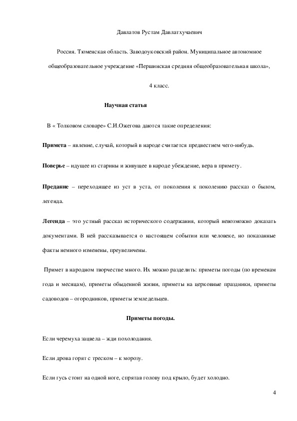 4) записать приметы, поверья, преданья и легенды, бытующие среди жителей