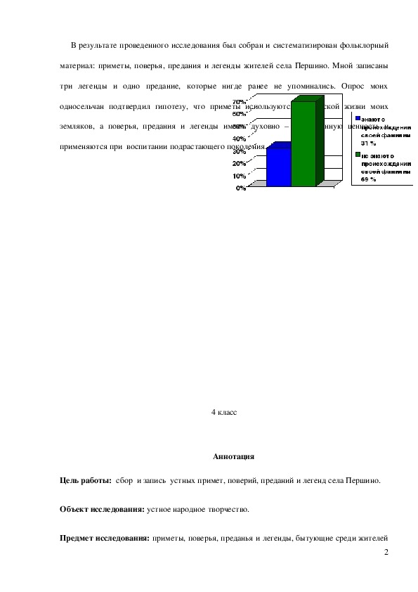 Цель работы: сбор и запись устных примет, поверий, преданий и легенд села Першино.
