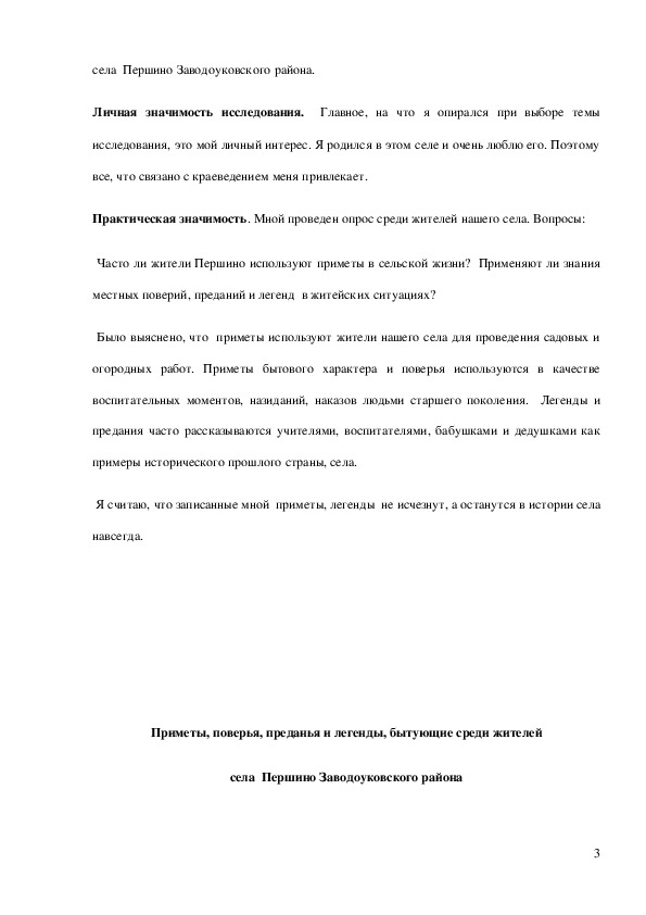 Предмет исследования: приметы, поверья, преданья и легенды, бытующие среди жителей села Першино Заводоуковского района.