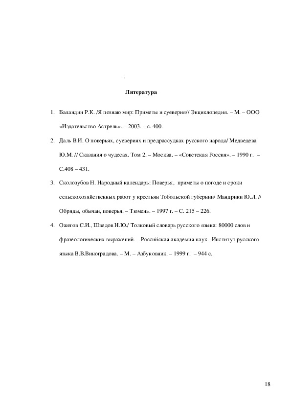 1. Баландин Р.К. /Я познаю мир: Приметы и суеверия// Энциклопедия. – М. – ООО