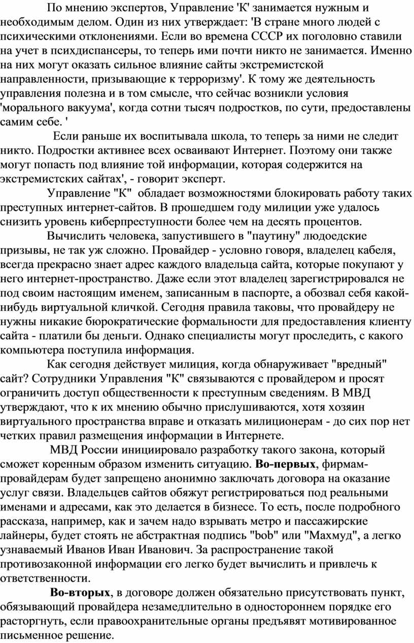 По мнению экспертов, Управление 'К' занимается нужным и необходимым делом. Один из них утверждает: 'В стране много людей с психическими отклонениями. Если во времена СССР их поголовно ставили на учет в психдиспансеры, то теперь ими почти никто не занимается. Именно на них могут оказать сильное влияние сайты экстремистской направленности, призывающие к терроризму'. К тому же деятельность управления полезна и в том смысле, что сейчас возникли условия 'морального вакуума', когда сотни тысяч подростков, по сути, предоставлены самим себе. '