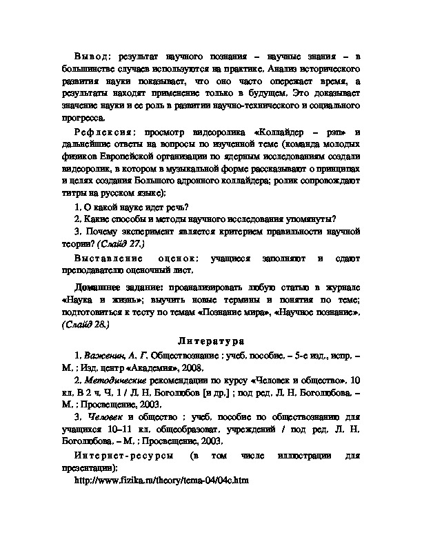 себе – “знание ради знания” – это миф или реальность?». (Слайд 26.)В ы в о д : результат научного познания – научные знания – в