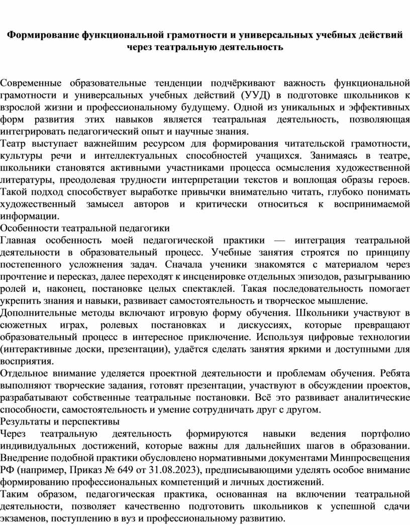 Современные образовательные тенденции подчёркивают важность функциональной грамотности и универсальных учебных действий (УУД) в подготовке школьников к взрослой жизни и профессиональному будущему. Одной из уникальных и эффективных форм развития этих навыков является театральная деятельность, позволяющая интегрировать педагогический опыт и научные знания.
